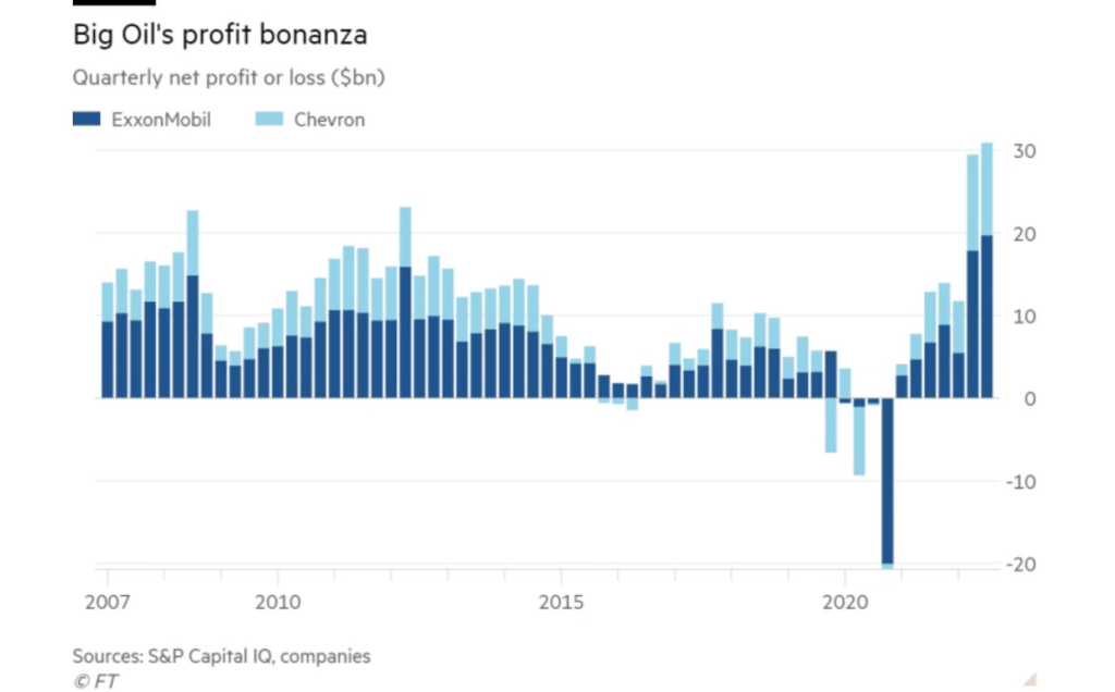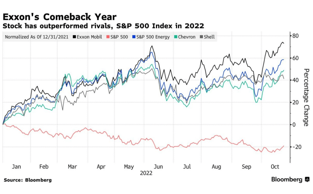 Exxon and Chevron are the latest big energy firms to report piled-up profit this year. Exxon, for starters, boasted its strongest quarter in its 152-year history. The oil and gas behemoth’s earnings nearly tripled from the same time last year to hit a more-than-expected $20 billion, pumped up by extra production and bumper natural gas prices. Chevron’s results weren’t too shabby either: it almost doubled its profit to hit the $11-billion mark, just shy of the record earnings it made the quarter before. Investors celebrated by sending the two companies’ shares higher on Friday, meaning both stocks have now outperformed the wider market by over 70% this year.