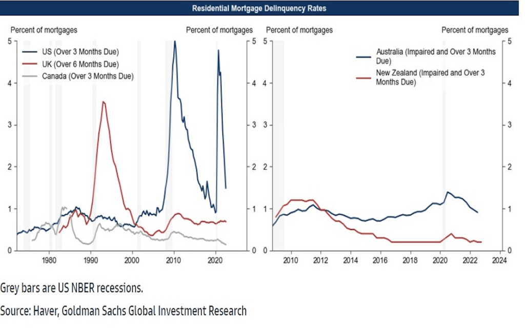 Goldman’s model estimates that falling house prices wouldn’t create a severe impact on default rates. For example, a 10% decrease in home prices usually leads to an increase in delinquency rates of about 0.14 percentage points in the US, and just less than 0.1 percentage points in the UK, Canada, Australia, and New Zealand. Home prices are less important than unemployment when it comes to defaults. Goldman believes this is down to the fact that these mortgages are “full recourse”, meaning people are incentivized to repay them because they know their lenders can seize assets or income beyond the housing collateral if they default. Academic research shows that just 6% of US defaults on mortgages involved a borrower who wasn’t incentivized to repay the loan because the amount they owed exceeded the home’s value.
