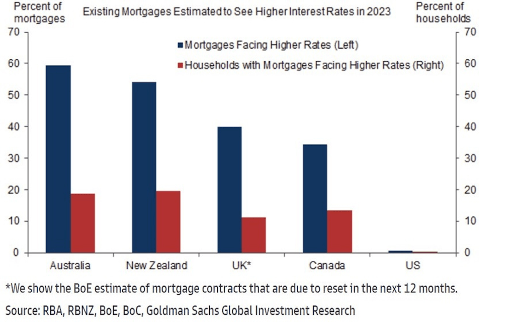 Higher interest rates and shorter mortgage periods can be a toxic combination – with consumers forced to adjust to often steep increases in their monthly housing costs. That’s why Goldman estimates that much larger potential “payment shocks” will hit the Australian, New Zealand, Canadian, and UK economies. The below chart shows a significant proportion of mortgages will reset to higher rates (blue bars, left axis). And it shows that around 20% of households in Australia and New Zealand will face higher interest payments in 2023, compared to about 10% of households in the UK and Canada (red bars, right axis).