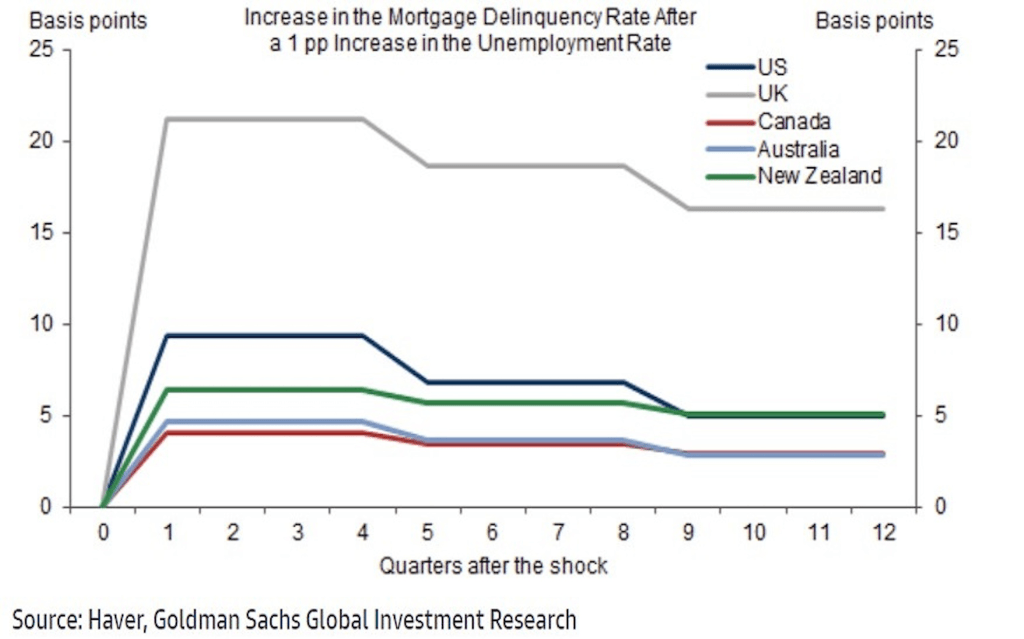 When there’s an economic downturn or a recession, unemployment typically rises. And losing a job makes it tougher to make mortgage payments, particularly in less affluent households where the savings might not stretch very far. Using a sophisticated statistical technique, Goldman estimated the effect of unemployment on mortgage delinquency rates. It found that a one-percentage-point increase in the unemployment rate would push up UK delinquency rates by 0.2 percentage points after a year. In the US, the delinquency rate would rise by only half as much – 0.1 percentage point. And in Canada and Australia, the results would be far more muted.
