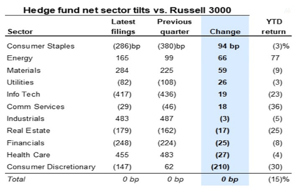 The main takeaway here is that hedge funds are allocating more capital to defensive sectors, based on their returns so far this year: that includes consumer staples, utilities, energy, materials, and industrials, which are all outperforming the Russell 3000 index’s 17% loss so far this year.