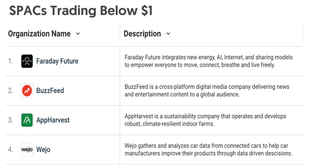 And trading below $1 isn’t necessarily the worst fate for a troubled SPAC. A few others have either declared bankruptcy or sold to acquirers for an even smaller pittance of their former price.
